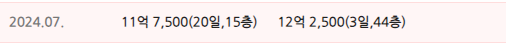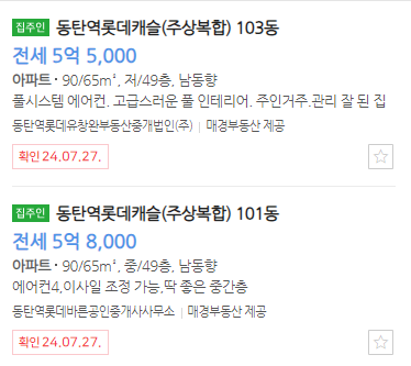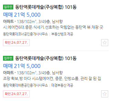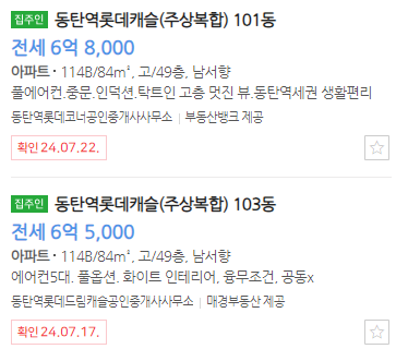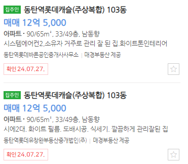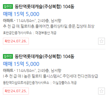 2024년 7월 기준 동탄역 롯데캐슬의 호가 및 실거래가입니다.